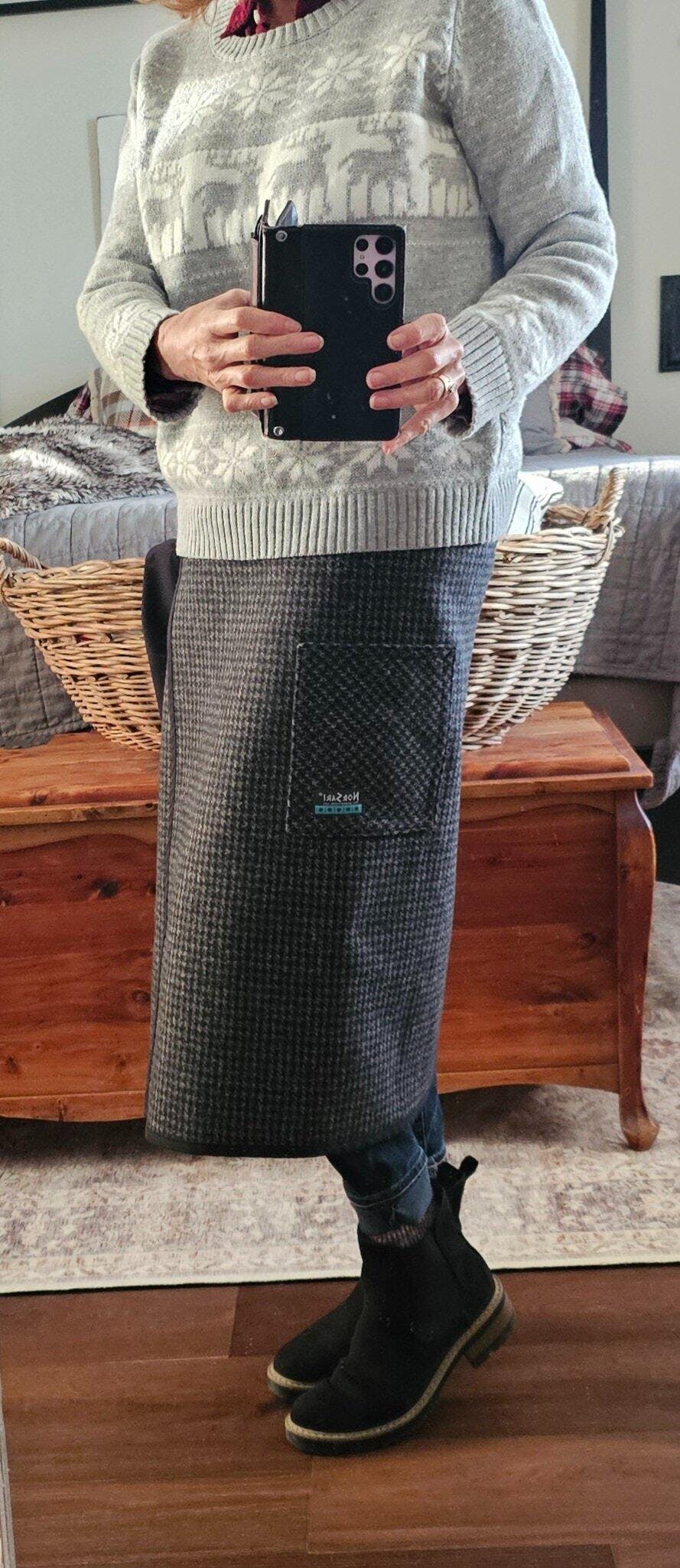 The NorSari is intended to be worn over your clothing for an added layer of warmth. It has an adjustable velcro closure at the waist and a functional front pocket for keys and a cellphone. Wear it with style!